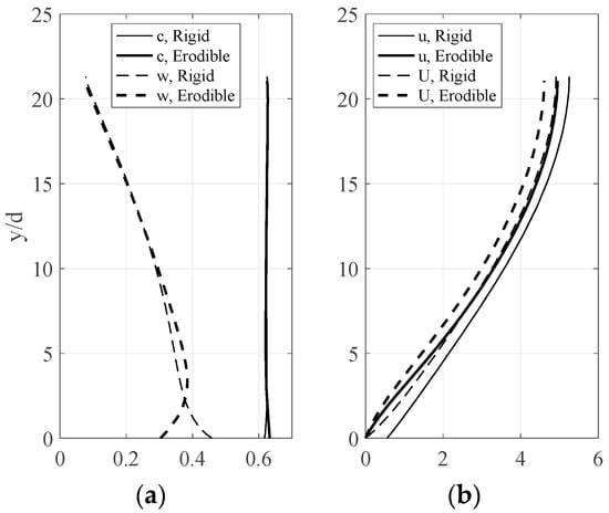 We employ values of the parameters e, μ, and μw that permit the calculation of profiles of flow and fluctuation velocity for smaller plastic particles []. All of the parameters have an effect on the flow depth and on the particle and fluid velocities. The sensitivity of the solution to the mass holdup, m, is due to its influence on cc. Moreover, as indicated in Equation (7), the flow slope and the wall friction have competing influences on the solution. The mass holdup, m, over the rigid base is taken to be the same as that over the erodible bed.