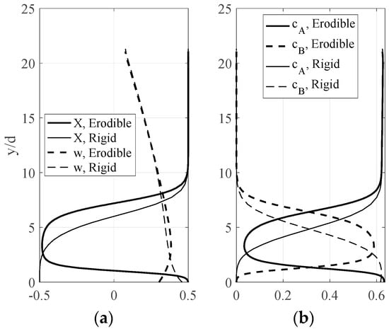 Profiles over erodible (dark) and rigid (light) boundaries for spheres of the same material with δr = 0.50 and δm = 1.50δr of (a) segregation measure X and (b) particle concentrations of the larger (A) and smaller (B) spheres. For both the erodible boundary and the rigid base, NA = NB. The flow geometry, particle properties, erodible boundary condition, and rigid base bumpiness and mass holdup are the same as in Figure 1.