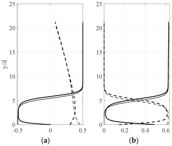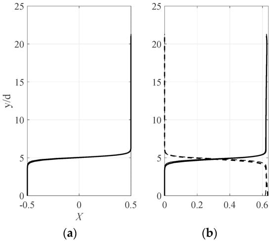 Here, for simplicity, we do not include the small influence that the differences in size and mass of the two types of spheres have on the profiles of mixture concentration, velocity, and temperature []. Then, the mixture profiles for these quantities are those given in Figure 1.