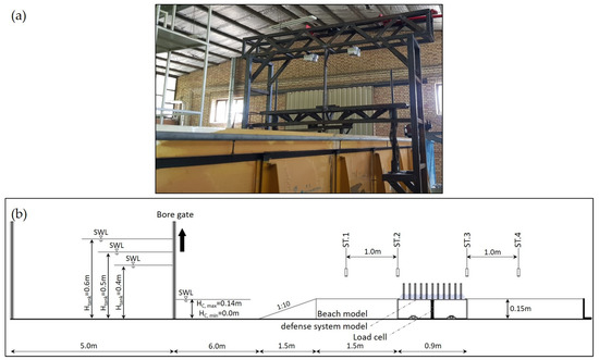 The physical scale of the present study is 1:20 and Froude’s similarity law is applied to produce the scaled model; the corresponding water levels and constant water depth were set to 0.40, 0.50, and 0.60 m and 0.0, 0.07, 0.10, and 0.14 m, respectively. The Froude number of generated flows is in the range of 0.73 to 2.36, which offers a suitable range for the experimental modelling of flooding surges [37,38,39,40,41].
