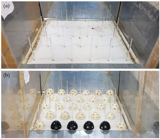 Figure 2 shows the arrangement of the coastal trees with the reef ball modules combination. The characteristics of a low-density forest (with a density of less than 0.5%) were used to investigate the proposed solution’s performance. The specifications of the mangrove forest of the Makran coast in south-eastern Iran, which consists of Rhizophora species with a density of 1103 units per hectare, were selected [39,40]. Mangrove trees are often replicated using vertical cylinders of Plexiglas cylinders and their flexibility was neglected by various researchers [30,40]. To ensure geometric similarity, Plexiglas cylinders with a diameter of 0.01 m and a height of 0.25 m were placed in a staggered arrangement with a surface density of 0.3%, and they were assumed to be rigid (Figure 2a). Reef balls were made by 3D printing from ABS material with a diameter of 0.1 m and a height of 0.06 m (Figure 2b). As shown in Figure 2, only one forest density, corresponding to a low-density forest, was tested in a 0.9 m width and we focused on the effect of a combination of reef ball modules with single trees to augment their protection role in the examined band.
