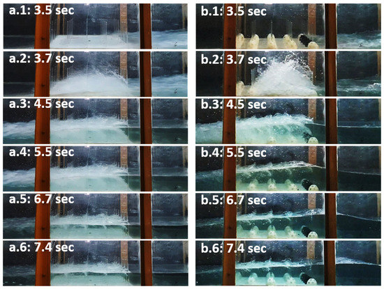 Figure 3 depicts the snapshots of the inundation pattern inside the combined forest with reef balls. As seen, a bore-type flow with a turbulent front was generated in both cases, and the bore height, velocity, and turbulence intensity at the bore front was changing rapidly. The generated bore rushed onto the sloping part of the test section measured at St.1, while the maximum height measured of HBore is in the range of 0.093 to 0.172 m. Due to the presence of the defense system models, the bore front collision causes the water to splash over the models, accompanied by turbulence in the initial moments.