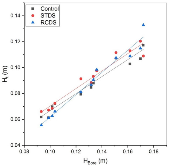 Figure 4 depicts the transmitted flow height (Ht) versus the incident bore height (HBore). As seen, due to the amplification of the bore height and the streamlines through the test section, the transmitted flow height Ht measured at St.4 does not show a remarkable decrease for the control case compared with both the STDS and RCDS cases. The same observation is also reported by Zaha et al. [29] and Ahmed and Ghumman [46] for their hybrid defense systems. This might be attributed to the experimental limitations and narrow width of the modeled forest.