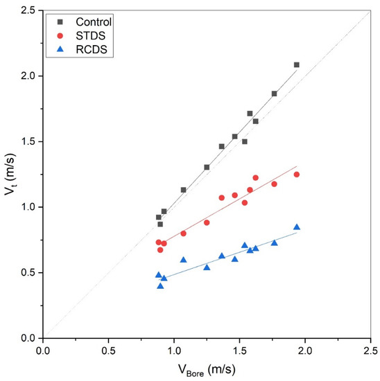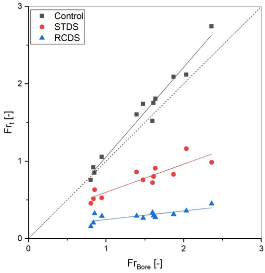 Figure 5 shows the transmitted flow velocity (Vt) versus the incident bore velocity (VBore). As seen, contrary to the bore velocity upstream of the test section, the transmitted velocity decreases downstream of the test section. Flow velocity in the presence of the STDS model and the RCDS model, respectively, decreased by an average of 29.5% and 56.2%. The fitted graphs’ growth rate compared to the control case decreased by 47.5% and 68.7%, respectively. A close look at Figure 3, Figure 4 and Figure 5 indicates that in the hybrid defense system, by changing flow conditions, the drag forces reduced and the reef ball arrangement may influence the mitigation effect of the defense system.