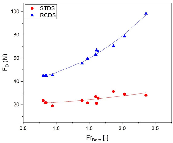 The absorbed drag force (FD) of the STDS and RCDS models are depicted in Figure 7. The measured reduced drag force is equal to the maximum shear force absorbed by the defense section when the bore is passing through it. As expected, the drag force is decreased for the tests with defense system models under similar flow conditions. The exerted force imposed on the defense system models is evaluated for the vegetation and reef balls with a similar method to Husrin [47] and Fathi-Moghadam et al. [43]. As can be seen from Figure 7, by increasing the bore Froude number (FrBore), more force is absorbed by both defense systems.
