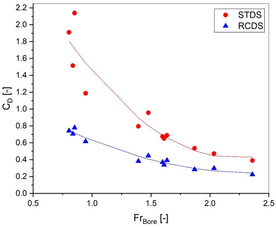 The variation of CD with the incident flow Froude number (FrBore) is shown in Figure 8 for both defense systems. The drag coefficient (CD) for each defense system is calculated using Equation (5), considering the models’ frontal area (Af), incident flow velocity (Vbore) passed through St.1 and St.2 from ultrasonic sensors and the drag force. As mentioned earlier, the incident bore with a higher Froude number has higher velocities and induces higher hydrodynamics force.