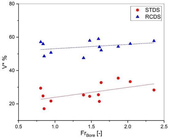 Bore velocity is one of the determining factors in the kinetic energy of the propagating tsunami and storm surge bore. It is essential to study changes in the velocity in the face of the defense systems’ performance. The velocity reduction rate is calculated using Equation (1) and compared for the STDS model and the RCDS model in Figure 9. The values of varied between 17.1% to 35.4% and between 47.6% to 59.0% reduction for the STDS and RCDS, respectively. Using the RCDS, a 111% increase in the defense system efficiency in reducing the bore velocity has been observed, resulting from the flow disruption caused by the increase in Af and the increase in turbulence behind the test section due to the presence of the porous structures.