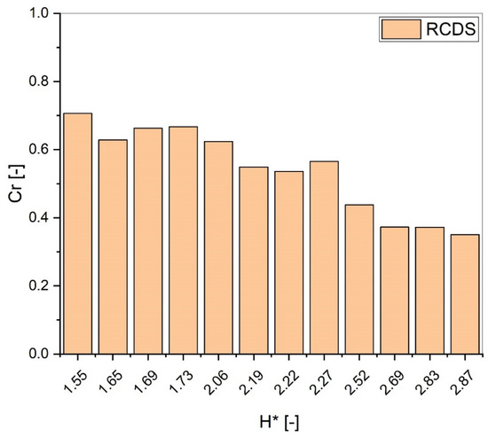 The values of Cr versus the non-dimensional bore height are presented in Figure 10. As seen for the RCDS model, this varied from 0.71 for the lowest to 0.35 for the highest . As the height of the incident bore increases, the inundation depth increases, while the frontal area engages a smaller percentage of the current. Hence, a reduction in the value of Cr seems reasonable.