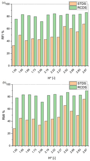 The calculated values for RFI and RMI, using Equations (6) and (7), are shown in Figure 11. By changing the protection system from the STDS to the RCDS, on average, a 70% and 82% growth was obtained for the RFI and RMI values, respectively, caused by the presence of a reef ball structure collision effect as a result of the streamlining distortion. A similar trend for RFI and RMI was observed, although the fluid force index () was more affected by the decreased flow velocity after the models than the reduced water depth. The moment index () was influenced by the flow velocity and depth in the same order. As mentioned before, the measured values for the flow height after both models did not show a significant difference; therefore, a similar trend of RFI and RMI seems reasonable.