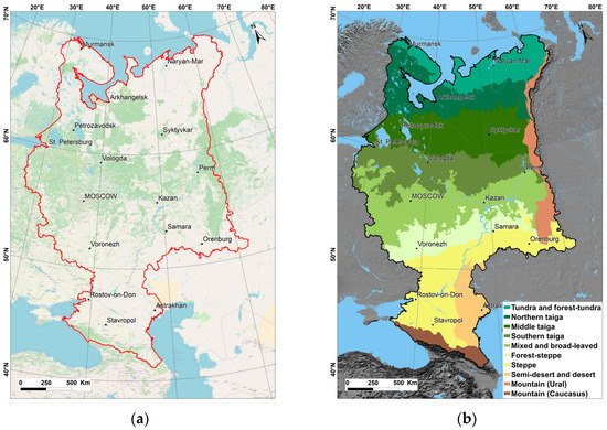 The total area of the EPR is approximately 3.8 million square kilometers, with the studied plains covering an area of 3.5 million square kilometers (excluding the Caucasus and the Ural Mountains). This extensive territory spans over 2400 km from north to south and exhibits significant landscape diversity (Figure 1, Table 1). Notably, more than 80 million people live within the boundaries of this region.
