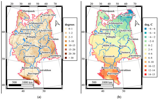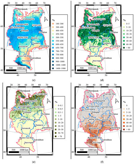The natural conditions of the study area that lead to the formation of the SSY are presented in a GIS tool available on the open access geoportal “River basins of the European part of Russia” [32,33]. Some geographical conditions of SSY formation in the study area are shown in Figure 2. The absolute heights of the relief range from −28 to 830 m, and the average height is about 140 m. About 60% of the catchments have slopes ranging from 0.5 to 1.5°, and less than 0.5% of the territory has steep slopes (Figure 1a). Temperature characteristics have a zonal distribution. The average annual temperature ranges from −8 °C in the northeastern part of the EPR to 12–14 °C on the coast of the Black Sea and the Caspian lowland (Figure 1b). The annual precipitation reaches maximum values of about 600 mm in the western part of the EPR, with a trend towards decreasing in the north and southeast (Figure 2c). The distribution of precipitation is highly heterogeneous among landscape zones. According to the lithological structure, sedimentary poorly defined formations and chemoorganogenic rocks are the most common. Clay and heavy loamy soils predominate in the granulometric composition of soils. There are also light and medium loamy soils. The forest and swamp cover of the catchments decreases from north to south, as shown in Figure 2d,e. Arable land is located in the southern part of the EPR (as shown in Figure 2f), where highly fertile soils predominate, which have been subjected to intensive plowing for a long time. The landscape structure of the EPR is presented in Figure 1b and in Table 1. In more detail, the geographical conditions of SSY formation in the study area are described in our articles on soil erosion and liquid river runoff [34].