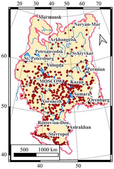 The long-term regime observations were systematized and generalized to create a database [33,35], which contains information on the geographical position of each station, the years of the runoff observations, the long-term average of SSY value (kg/s) and the area (sq. km) of the surface catchment associated to the station. Figure 3 shows the localization of gauging stations in the EPR plains.