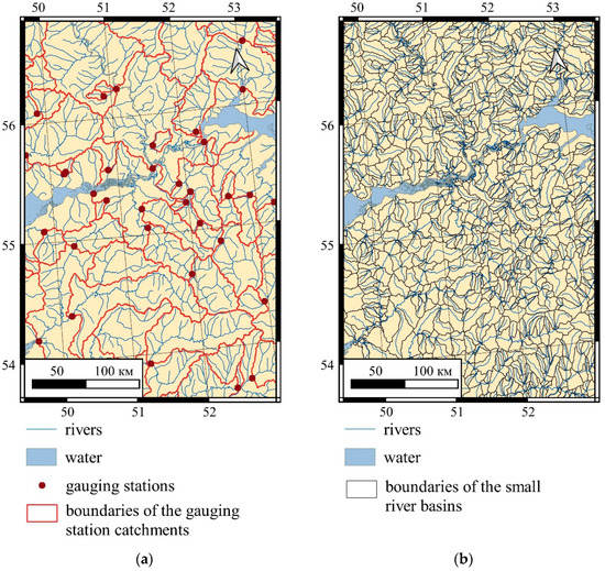Fragments of two basin grids: (a) the boundaries of the gauging station catchments; (b) the boundaries of the small river drainage basins.