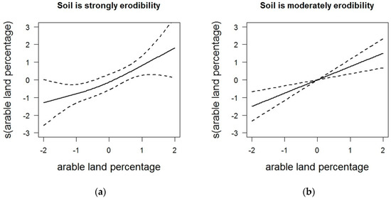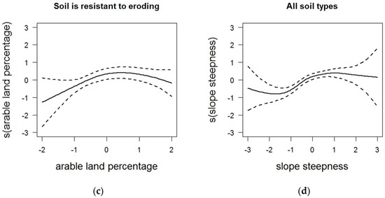 Examples of the GAM model particular dependences of the logarithm of SSY per unit area on explanatory variables (horizontally—standardized predictor value, vertically—its contribution to model): (a) arable land percentage in basin where soil and soil-forming rock is strongly erodibility; (b) arable land percentage in basin where soil and soil-forming rock is moderately erodibility; (c) arable land percentage in basin where soil and soil-forming rock is resistant to eroding; (d) average steepness of slopes in basin.