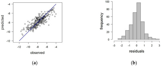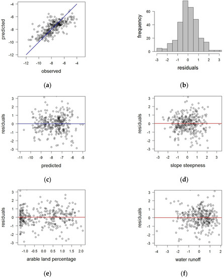 Figure 6 and Figure 7 demonstrate the quality of the models constructed using the GLM and GAM methods, respectively. The figures compare the observed and predicted logarithms of SSY per unit area with predicted values plotted against observed values. The figures also display frequency histograms of residual values, as well as diagrams that illustrate the relationship between residuals and both predicted values and predictor values.