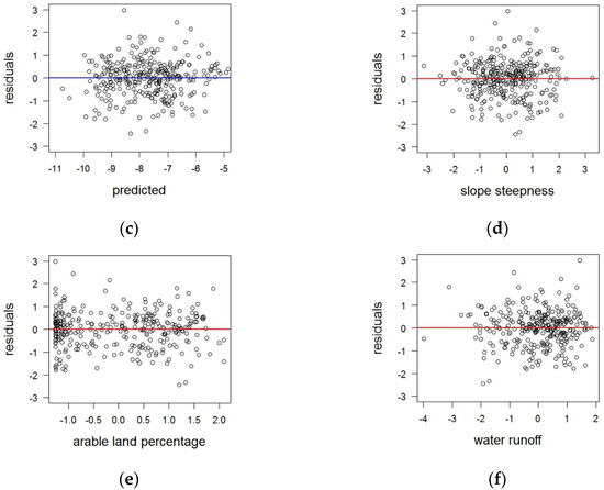 Diagrams illustrating the quality of the constructed GLM model of the logarithm of SSY per unit: (a) observed values versus predicted values; (b) frequencies histogram of residuals values; (c) predicted values versus residuals; (d–f) model predictors values versus residuals.