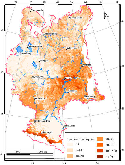 The map (Figure 7) highlights the latitudinal zone from 50° N to about 58° N with high SSY values. Here, in the west-eastern direction, SSY values increase from 20–50 to 100 t per year per sq. km. This latitudinal area of high SSY values is located in the EPR region, where river basins are heavily plowed (50–80%) (Figure 2f), have less than 10% forest cover (Figure 2d) and almost no swamps act as SSY interceptors (Figure 2e).