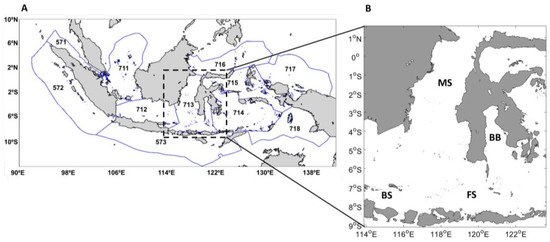IFMA is divided into 11 areas, as illustrated in Figure 1A. Among these areas, IFMA 713 encompasses the Makassar Strait (indicated as MS in Figure 1B) along with its adjacent waters, including Bone Bay, Flores Sea, and Bali Sea (represented as BB, FS, and BS in Figure 1B, respectively). This particular region is of significant interest to our study. IFMA 713 boasts abundant fish resources and serves as a crucial fishing ground in Indonesia, particularly for small pelagic, large pelagic, demersal, and reef fish species that are consumed by the local population. According to the Directorate General of Capture Fisheries (2015) [41], IFMA 713 contributed to the second-largest fish production in Indonesia in 2014, accounting for 12.43% of the total national production (6,037,654 tons). Moreover, these areas are characterized by diverse marine and coastal ecosystems, including coral reefs, mangroves, and seagrass [42,43].