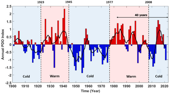 Annual PDO index from 1900 to 2021. The black curve is the 9−year moving average.