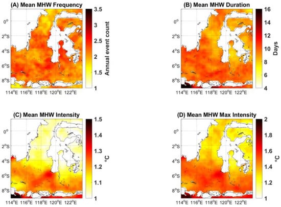 The characteristics of the average MHWs during the years 1982–2021 in IFMA 713 can be seen in Figure 3. The frequency of MHWs was in the range of 1.5–2.6 events per year (Figure 3A). Locations with high frequency are seen in the Flores Sea and Bone Bay (denoted by FS and BB in Figure 1B, respectively). Furthermore, for the MHW duration, the average ranged around 6–12 days for each event (Figure 3B). The areas with long duration were also mostly found in the south of IFMA 713 or the Flores Sea area, while the area with short duration was in Bone Bay and mid-Makassar Strait at 2° S. Figure 3C,D showed a distribution of the mean and maximum intensities of MHWs, respectively, in which the southern region of IFMA 713 tends to have a higher maximum intensity than the northern region. The mean and maximum intensities of MHWs are in the range of 1.0–1.3 °C and 1.1–1.7 °C, respectively (Figure 3C,D). The area with the highest mean maximum intensity is at coordinates 118.0°–119.6° E and 5.25°–6.17° S (Figure 3D).