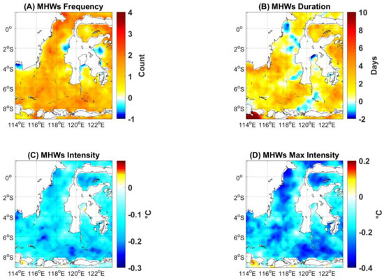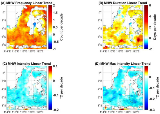 The linear trend of the duration of MHWs is the same as the frequency of MHWs, which is spatially dominated by a positive sign (Figure 5B). However, some areas have a negative linear trend of MHW duration. The linear trend of the duration of MHWs ranged from −1 to 4 days per decade. Most of the positive linear trend values have a p-value of less than 0.05 so it can be classified as a significant linear trend. Meanwhile, areas that have a negative linear trend have a p-value of more than 0.05. Figure 5C,D showed that the mean and maximum intensities of MHWs have a dominantly negative linear trend, with a range of 0 °C to −0.12 °C and 0 °C to −0.2 °C per decade, respectively. However, there were a small number of areas in Makassar Strait with positive linear trends of MHW maximum intensity with a very small value of around 0.05 °C per decade. Most areas of IFMA 713 have a significant linear trend marked by black dots indicating a p-value of less than 0.05.