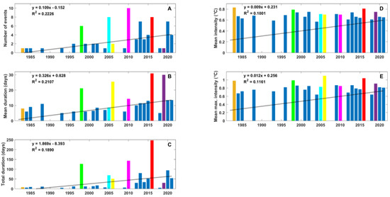 To better understand the temporal changes in the parameters of MHWs, a calculation of the spatial average of the frequency, duration, total days, mean intensity, and maximum intensity of MHWs each year across all areas of IFMA 713 was carried out. The annual characteristics can be seen in Figure 6. The frequency of MHWs throughout 1982–2021 appeared to have a maximum value in 2010 with an average number of events of 10 (denoted by the magenta bar in Figure 6A). Subsequent high frequencies occurred in 2005 and 2016 with 8 events for each year (denoted by the cyan and red bars in Figure 6A, respectively).