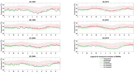 Using the prominent MHWs detected in Figure 6, we computed a spatial average of SST for the entire IFMA 713. We then created time-series graphs for each year (1983, 1998, 2005, 2006, 2010, 2016, and 2019), depicting the development of each MHW event in those years and categorizing them based on intensity [55], as shown in Figure 7A–G.