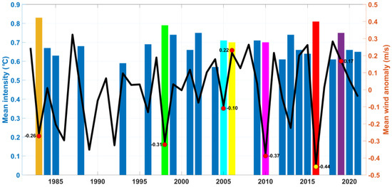 Annual wind speed anomaly over the period of 1982−2021, along with the mean intensity of MHWs within the IFMA 713. The colored bars, excluding the blue ones, represent the prominent MHW years. Dots on the graph indicate the wind speed anomalies during those notable MHW years, and the corresponding values (in m/s) are highlighted in the text.
