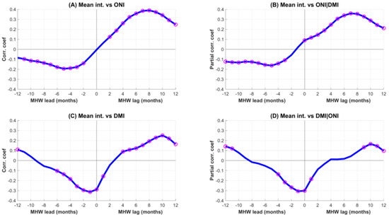 The lead−lag correlations between the MHW mean intensity and the following variables in IFMA 713: (A) ONI, (B) partial correlation with ONI, (C) DMI, and (D) partial correlation with DMI. The magenta dots represent significant correlations (p < 0.05).