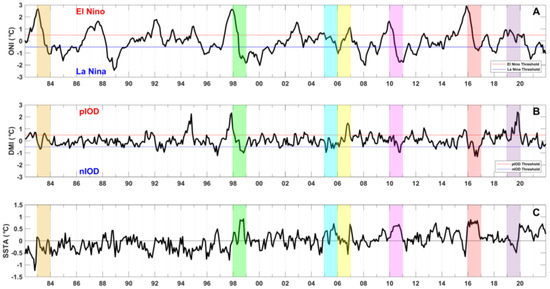 Time series of (A) ONI, (B) DMI, and (C) SST Anomaly. The ONI and DMI values are presented monthly and have been smoothed using a 6−month moving average. In graphs (A,B), the red line represents the El Niño (pIOD) threshold, while the blue line represents the La Niña (nIOD) threshold. The graph in (C) illustrates the daily SST anomaly averaged over the IFMA 713, which has also been smoothed using a 6-month moving average. The shaded color highlights the prominent years of MHWs, namely 1983, 1998, 2005, 2006, 2010, 2016, and 2019.