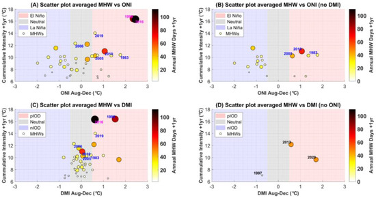 After calculating the correlation coefficients and lags between the mean intensity of MHWs and ENSO and IOD, as shown in Figure 9, the next step involves mapping the annual occurrences of MHWs to gain a comprehensive overview of their frequency in IFMA 713 across different ENSO and IOD phases (Figure 11). This analysis allows us to examine the cumulative intensity values and total duration of MHWs associated with the ENSO and IOD indices, providing a more holistic understanding of MHW patterns in IFMA 713. To select the ENSO and IOD indices, we focused on the period from August to December, as these months exhibited stronger values compared to other periods within the 40-year timeframe. Subsequently, the annual occurrences of MHWs were plotted against the cumulative intensity values on the y-axis. In this plot, the cumulative intensity values were derived using MHW data from the subsequent year and aligned with the ENSO and IOD index data on the x-axis. This approach is informed by the findings of the cross-correlation analysis, which revealed a lag of 7–9 months between the incidence of ENSO and IOD and the occurrence of MHWs. Consequently, the ENSO and IOD indices in year x contribute to the manifestation of MHWs in year x + 1.