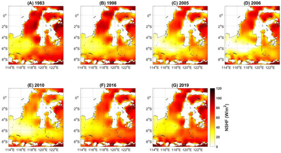 To delve deeper into this aspect, the study calculated the NSHF to assess the energy absorbed and released by the ocean’s surface. Figure 12A–G present the average NSHF values for 1983, 1998, 2005, 2006, 2010, 2016, and 2019. Through spatial averaging, it was determined that the NSHF values for 1983 and 2019 were the highest among the seven years, reaching 42.67 and 42.59 W/m2, respectively (as indicated in Table 3). This substantial NSHF likely contributed to the elevated mean intensity of MHWs in 1983 (0.83 °C) and 2019 (0.75 °C). In the remaining years, the NSHF ranged from 29.46 to 40.38 W/m2.
