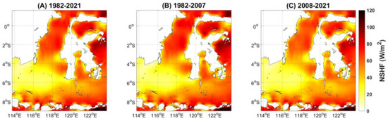 Average NSHF expressed in W/m2 for three distinct periods in IFMA 713: (A) 40 years (1982–2021), (B) warm phase of the PDO (1982–2007), and (C) cold phase of the PDO (2008–2021).
