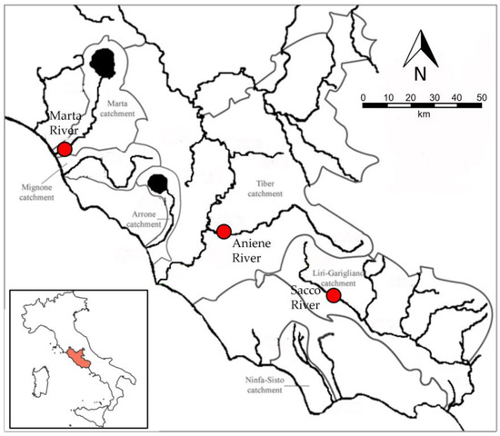 The sites are surrounded by different land uses; the Aniene River is predominantly characterized by urban use, while the Marta River and the Sacco River are characterized by agricultural use. The Aniene River flows entirely within the Lazio Region (99 km) and is the second largest tributary of the Tiber River, crossing a large part of the city of Rome, which is characterized by a high degree of anthropization [38]. The investigated site is located in the urban park of Aniene Valley in the east part of Rome city, where the Aniene receives many WWTPs discharges. The Marta River flows into the Tyrrhenian Sea after a course of 54 km, and the site of investigation is located in the cultivated countryside near Tarquinia, a small city in the north of the Lazio Region. Finally, the Sacco River, a tributary of the Liri River, flows for 87 km in the territory of Frosinone, in the south of Lazio, and is surrounded by an agricultural and industrial context. The investigated site is located near Colleferro city, where the river becomes polluted due to the discharges of many industries in the area [39].