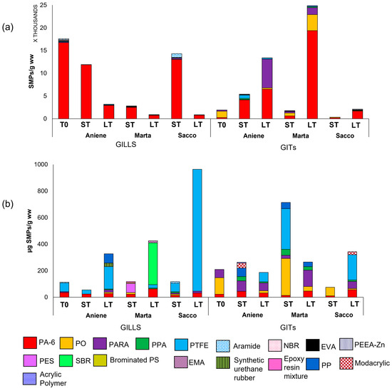 Concentration (a) and weight (b) of different small microplastic polymers (SMPs) in the gills and GITs of bivalves A. cygnea exposed in three rivers (Aniene, Marta, Sacco) for a short time (ST) and long time (LT). T0 refers to the individuals of pre-exposure. For each polymer, the abbreviation is reported: acrylic polymer = ACRYLIC POLYMER; aramide = ARAMIDE; brominated polystyrene = BROMINATED PS; epoxy resin mixture = EPOXY RESIN MIXTURE; ethylene methyl acrylate copolymer = EMA; ethylene vinyl acetate = EVA; modacrylic = MODACRYLIC; nitrile-butadiene rubber = NBR; polyamide = PA-6; polyarylamide = PARA; polyester = PES; polyethylene acrylic acid copolymer-zinc salt = PEEA-Zn; polyolefin = PO; polyphthalamide = PPA; polypropylene = PP; polytetrafluoroethylene = PTFE; styrene–butadiene Rubber = SBR; synthetic urethane rubber = SYNTHETIC URETHANE RUBBER.