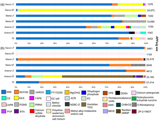 Concentrations in percentage (%) and total of different additives, plasticizers, and other micro-litter components (APFs) in A. cygnea (a) gills and (b) GITs exposed in three rivers (Aniene, Marta, Sacco) for short time (ST) and long time (LT). T0 is referred to the individuals of pre-exposure. For each additive, the abbreviation is reported: 50% active glycerol monostearate in polyethylene carrier = GMS; benzotriazole = BTA; Bromodiclorometahne = CHBrCl2; butyl vinyl ether = NBVE; calcium pelargonate = CALCIUM PELARGONATE; calcium stearate = CS; calcium sulfate dihydrate = CALCIUM SULFATE DIHYDRATE; chloroalkyl phosphate ester = CPE; cocoamidoproyl betaine = CAPB; dodecenylsuccinic anhydride = DDSA; hombitan TiO2 = HOMBITAN TIO2; Magnesium hydroxide = Mg(OH)2; methyl alkyl imidazoline sodium salt = METHYL ALKYL IMIDAZOLINE SODIUM SALT; methyl chloride = Methyl chloride; N-(2-ethoxyphenyl)-n-(2-ethylphenyl)-ethanediamide = NNE; nichel-dibuthyldithiocarbarmate = NDBC-O; Octadecanoic acid, calcium salt = OC SALT; octenylsuccinic anhydride succinic = OCTENYLSUCCINIC ANHYDRIDE SUCCINIC; O-nitrobiphenyl = O-NITROBIPHENYL; pentabromodiphenyl oxide = PENTABROMODIPHENYL OXIDE; phosphate ester fatty acids blend = FAPE; Poly(N-methyl acrylamide) = PNMA; polyether, quaternary ammonium salt mixture = POLYETHER, QUATERNARY AMMONIUM SALT MIXTURE; polyvynilpirollidone = PVP; propyl zithate = ZP-2-YMDT; Propylene carbonate = PC; propylene glycol monostearate = PGMS; rayon = RAYON; reoflam dmmp = REOFLAM DMMP; Silk = SILK; sodium polyacrylate, polyacrylic water = ACR; stearamidopropyldimethyl-hydroxyethylammonium-dihydrogen = DIHYDROGEN PHOSPHATE; triphenyl methane 4,4′,4″-triisocyanate in ethyl acetate = FT172229; varox 231 xl = VAROX.