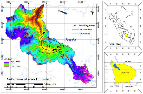 The study area comprised the Chumbao sub-basin (Figure 1). Hydrographically, the Chumbao River is located in the Pampas River’s lower part and right bank and originates in the high Andean zone at 4400 m. The sub-basin presents a Cwb climate according to Köppen, with marked seasons, in avenues with intense rainfall between October and March (from 500 to 1000 mm/year), and temperatures from 5 to 23 °C, and an average relative humidity of 55% [44].