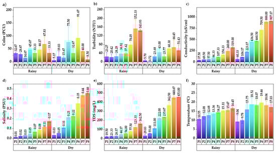 Values of physical parameters: (a) Color, (b) Turbidity, (c) Conductivity, (d) Salinity, (e) TDS, (f) Temperature.