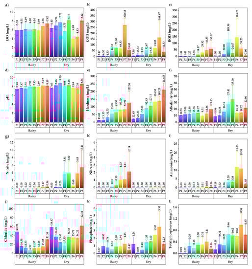 Values of chemical parameters: (a) DO: Dissolved oxygen, (b) BOD: Biochemical oxygen demand, (c) COD: Chemical oxygen demand, (d) pH, (e) Hardness, (f) Alkalinity, (g) Nitrite, (h) Nitrate, (i) Ammonia, (j) Chloride, (k) Phosphate, (l) Total phosphorus.
