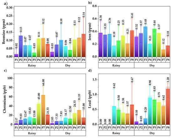 The concentration of Br, Fe, Cr, and Pb (Figure 4) presented values of up to 0.28 ppm, 0.48 ppm, 64.00 ppb, and 1.20 ppb, respectively. The level of Cr and Pb indicates the extent to which industrial activities have developed in the study zone [59,60,61].