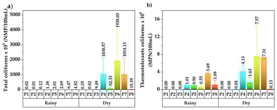 Values of microbiological parameters: (a) Total coliforms, (b) Thermotolerant coliforms.