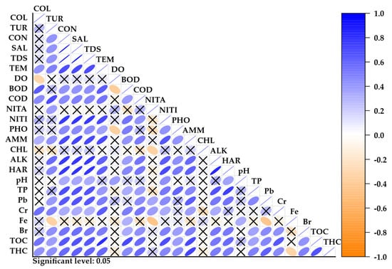 Correlation of water quality parameters of the high Andean River; X is not significant.