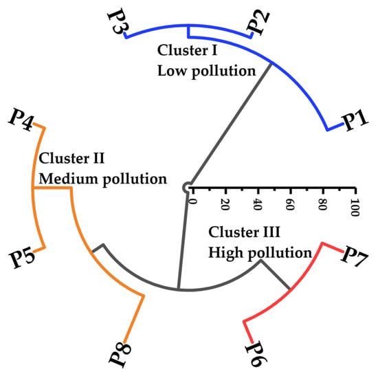 The dendrogram showed the clustering of three groups with a similarity index of 60% (Figure 7). Cluster I comprised points P1, P2, and P3, which are low pollution (LP) sites located in the headwater of the basin, where there is no anthropogenic presence. Cluster II included sites P4, P5, and P8, considered medium polluted (MP) sites, located in zones dedicated to agricultural and livestock activities, and sites P6 and P7 were part of Cluster III, which are highly polluted sites (HP), directly receiving domestic and industrial wastewater discharges.