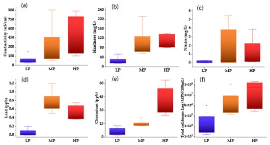 The spatial DA indicated that CON, NITI, HAR, Pb, Cr, and TCO are the parameters responsible for spatial variation (Figure 8). The evaluation showed that water CON was low in the LP zone with significant spatial variations, indicating that the dissolution of geological soil components and organic and inorganic substances introduced to the river channel caused an increase in water conductivity in the MP and HP zone. Likewise, the MP and HP sites reported high concentrations of HAR associated with cations in the water due to the study zone’s lithological origin and geological complexity [65]. The concentrations of Pb and Cr were high in the MP and HP zones, respectively, which is related to wastewater from mining and agricultural activities developed in the zone. This behavior is characteristic of zones of anthropogenic activity [59,60,61], while the presence of these metals in the LP zone could be due to their natural form in rocks or surface mineral grains that are mobilized by natural means or artificial recharge [66,67]. The presence of high concentrations of NITI in the MP zone would be associated with crop residues and nitrogen fertilizers [68,69]. The TCO levels were high at the HP zones, suggesting a critical level of microbial pollution. The spatial relationships between the variables showed more significant environmental pollution problems in the PM and HP zones.