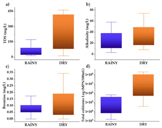 Season variations of: (a) TDS, (b) Alkalinity, (c) Bromine, (d) Total coliforms.