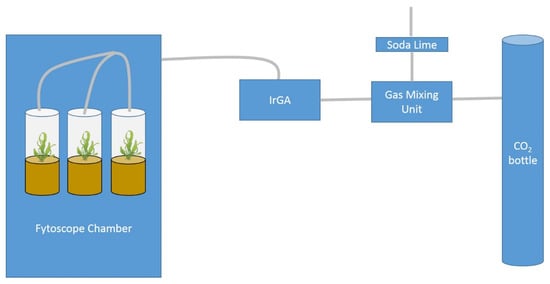 Schematics of the CO2 enrichment incubation system, consisting of a gas mixing unit regulated using an Infra-red Gas Analyser (IrGA) connected to a CO2 bottle and a soda lime cylinder to remove any ambient CO2, precisely recording the CO2 levels in the mesocosms.