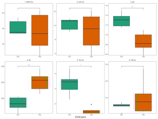 Spartina maritima sediments exposed to enriched CO2 air showed significant decreases in their pH and total carbon (TC) content (Figure 2). On the other hand, rhizosediment redox potential (Eh) showed a significant increase in the rhizosediments exposed to 700 ppm CO2. Relative water (RWC) and organic matter content (LOI), as well as total nitrogen (TN), were not disturbed by increased atmospheric CO2.