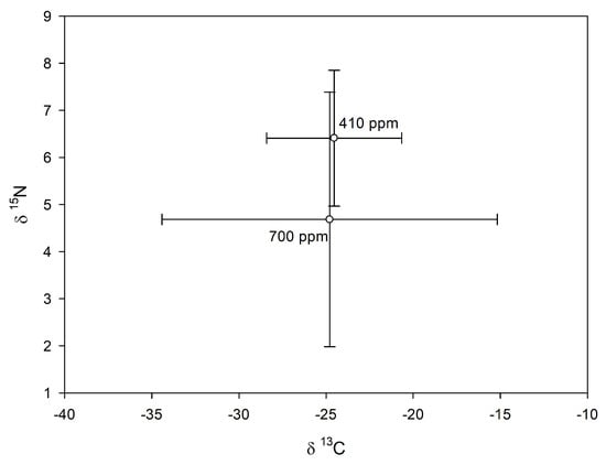 Carbon (d13C) and nitrogen (d15N) stable isotope signature of the rhizosediments exposed to 410 and 700 ppm atmospheric CO2 (average ± standard deviation, N = 5 replicates per treatment).