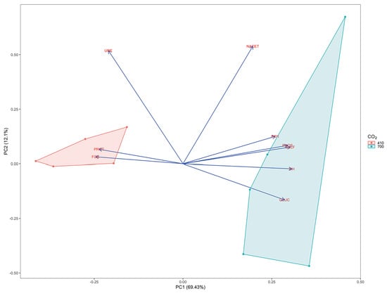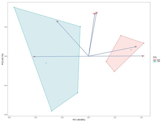 Principal Component Analysis (PCA) of the physic-chemical traits [relative water content (RWC), organic matter as loss on ignition (LOI), pH, redox potential (Eh) and total carbon (TC), and nitrogen (TN)] of the rhizosediments exposed to 410 and 700 ppm atmospheric CO2. Shaded polygons represent the area covered by a group of dispersed points that is delimited by its furthest points.