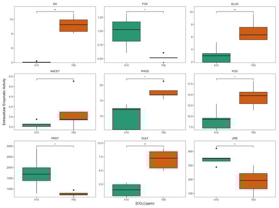 Extracellular Enzymatic Activities (EEAs) (DH, dehydrogenase; POX, peroxidase; FOX, phenol oxidase; PHOS, acid phosphatase; GLUC, b-glucosidase; NACET, N-acetylglucosaminidase; SULF, sulfatase; PROT, protease; URE, urease) of the rhizosediments exposed to 410 and 700 ppm atmospheric CO2 (values are given as mean and standard deviation of 5 replicates per species). Significant differences between treatments are represented by asterisks (Kruskal–Wallis test, followed by posterior multiple comparisons, * p < 0.05, ** p < 0.01).